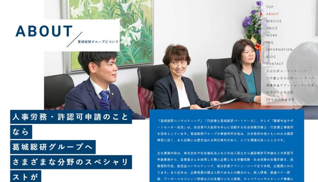 一般社団法人葛城総研グループは、社会保険労務士と行政書士事務所を母体とするグループです。「葛城総研コンサルティング」「行政書士葛城総研パートナーズ」「障害年金サポートセンター奈良」など、奈良・大阪エリアを中心に活躍しています。企業の経営や人事・労務管理に関する様々なサポート行うのが特徴です。