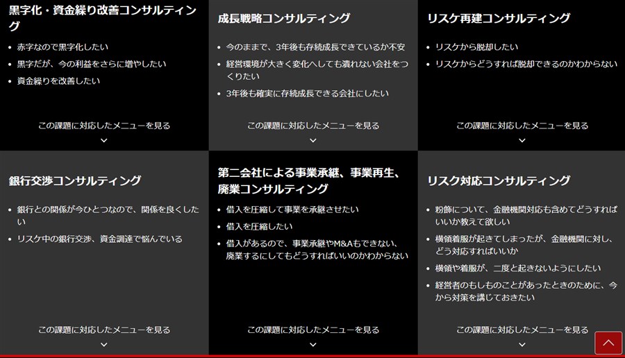 こちらの会社では、事業を守るとともに伸ばし、事業を引き継ぐことにも力を入れた経営コンサルティングを行っています。特に、経営の黒字化や資金繰りの改善、企業の存続をかけた成長戦略の作成、金融機関との関係を良くするリスケや銀行交渉、事業承継や事業再生、廃業などの分野を得意としています。