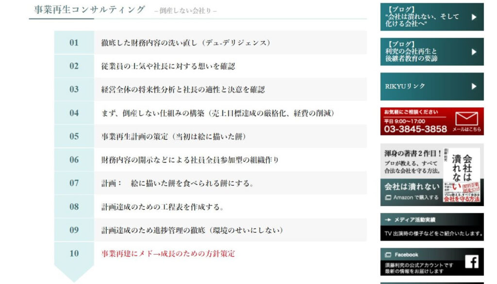 利究 RIKYU コンサルティングは明確な経営方針を掲げてサービスを提供しています。まず一つが、できるだけ多くの中小企業を倒産の危機から救うということです。小さい会社であっても、そこで働く従業員やその家族がいるので、簡単に会社をつぶすことは考えたくないというのが経営者の悩みでしょう。その点、こちらの会社では経営者とともに歩んでいく姿勢を持ち、右肩上がりの発展を遂げていけるよう支援を惜しみません。さらに、企業の発展には後継者の育成がカギであることを認識し、すべてを任せられる次期経営者の育成に力を注ぎます。