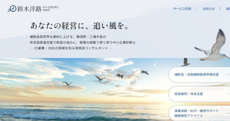 経営環境が激しく変化する中、中小企業の存続と成長には、補助金の活用や円滑な資金調達が欠かせません。神奈川県の横須賀・三浦半島エリアを中心に活動する「鈴木洋路 中小企業診断士 事務所」は、地域に根ざした経営のパートナーとして、多くの事業者を支援しているそうです。